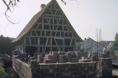 Ab diesem Zeitpunkt begannen die gemeinsamen Arbeiten am Alt- und Neubau: Beide Dächer wurden gedeckt, Treppen im Alt- und Neubau hergestellt, Elektrokabel verlegt, Zwischenwände gemauert und Bodenbeläge und Außenwände saniert und erneuert. Ende August 1986 waren schließlich die Rohbauarbeiten abgeschlossen und es konnte mit den Ausbauarbeiten begonnen werden. Bis zu diesem Zeitpunkt wuchsen die geleisteten Arbeitsstunden auf über 3.800 an.